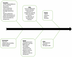 With the help of a fish bone diagram (Figure 1), the QI team analyzed the cause-effect scenario for adherence to osteoporosis guidelines and identified six possible categories of potential root causes contributing to whether a patient receives screening and counselling for osteoporosis when clinically indicated. The categories include prescribers, EMRs, patients, environment, system and policy. Prescriber applies to the clinician’s thought processes and actions. EMRs refers to the versatility and practicality of existing computerized clinical decision support systems such as reminders or an order-set associated with the letrozole prescription. Culture refers to the effect of previous experiences with osteoporosis management in the oncology service. Missing information applies to incomplete or unavailable data when the patient is assessed by the clinician. It was felt that having no EMR reminders, busy clinic, competing medical priorities and unclear responsibilities on who follows up for osteoporosis (i.e. assumption that the patient would undergo monitoring by her family physician) were the main key drivers for failure to screen for osteoporosis.