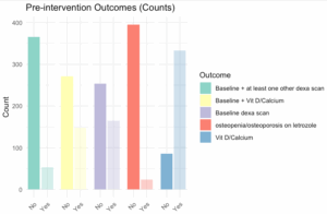 Statistical analysis of pre-intervention data confirmed that an intervention was necessary to improve the current standard of care surrounding letrozole use and osteoporosis screening. We wanted to find out if a simple EMR based intervention to remind prescribers of guidelines when prescribing letrozole long-term, would be beneficial. To achieve our goals, several strategies were employed. First, brainstorming sessions were held to better understand the barriers and ways to implement the EMR intervention.