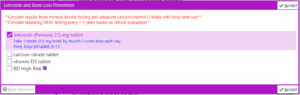 If selected, the letrozole order panel will include the letrozole prescription defaulted and calcium/vitamin D and baseline BMD which are not defaulted but selectable. At the top of the panel, in red is also the EMR-based reminder “Consider regular bone mineral density testing and adequate calcium/vitamin D intake with long-term use” and “Consider repeating DEXA testing every 1-2 years based on clinical indications” (Figure 6 and Figure 7).