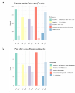 n = number of patients in the pre-intervention, post-intervention group and overall; BMD scan 1, 2, 3 – patients who received follow-up BMD date 1, 2, 3; No BMD – patients who had no DEXA scan (BMD) documented; Guidelines – patients who received a baseline DEXA scan and at least one other (interval surveillance) DEXA scan; Calcium or Vitamin D – patients who were counselled to take calcium or vitamin D therapy; Baseline DEXA scan and vitamin D and/or calcium – patients who received a baseline DEXA scan and vitamin D and/or calcium.